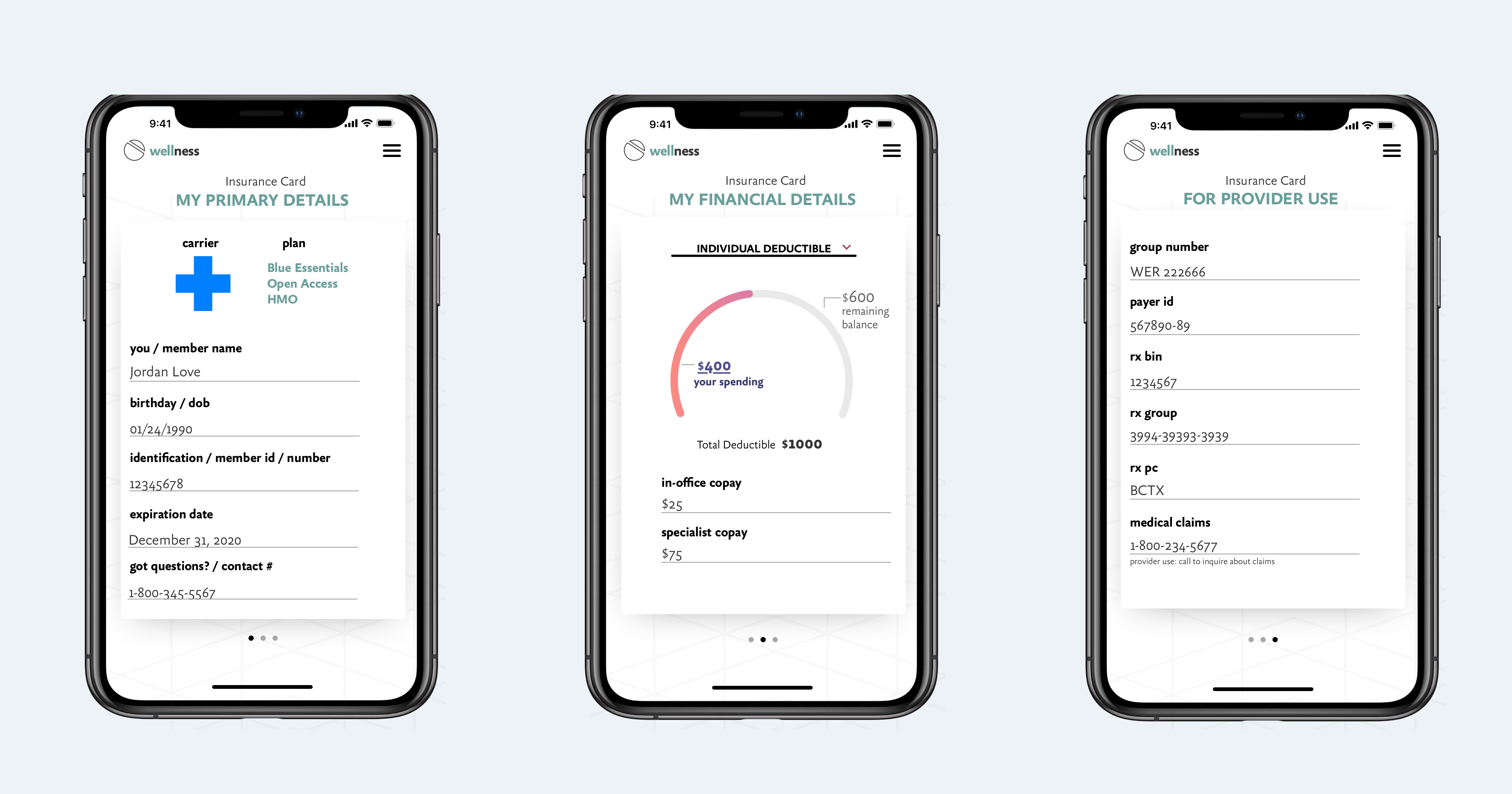 Cellphones hold most of our important information and we tend to keep our device close, so why not have access to your digital insurance card from your phone? There are 3 views categorized by need (i.e., personal details, financials, provider details).