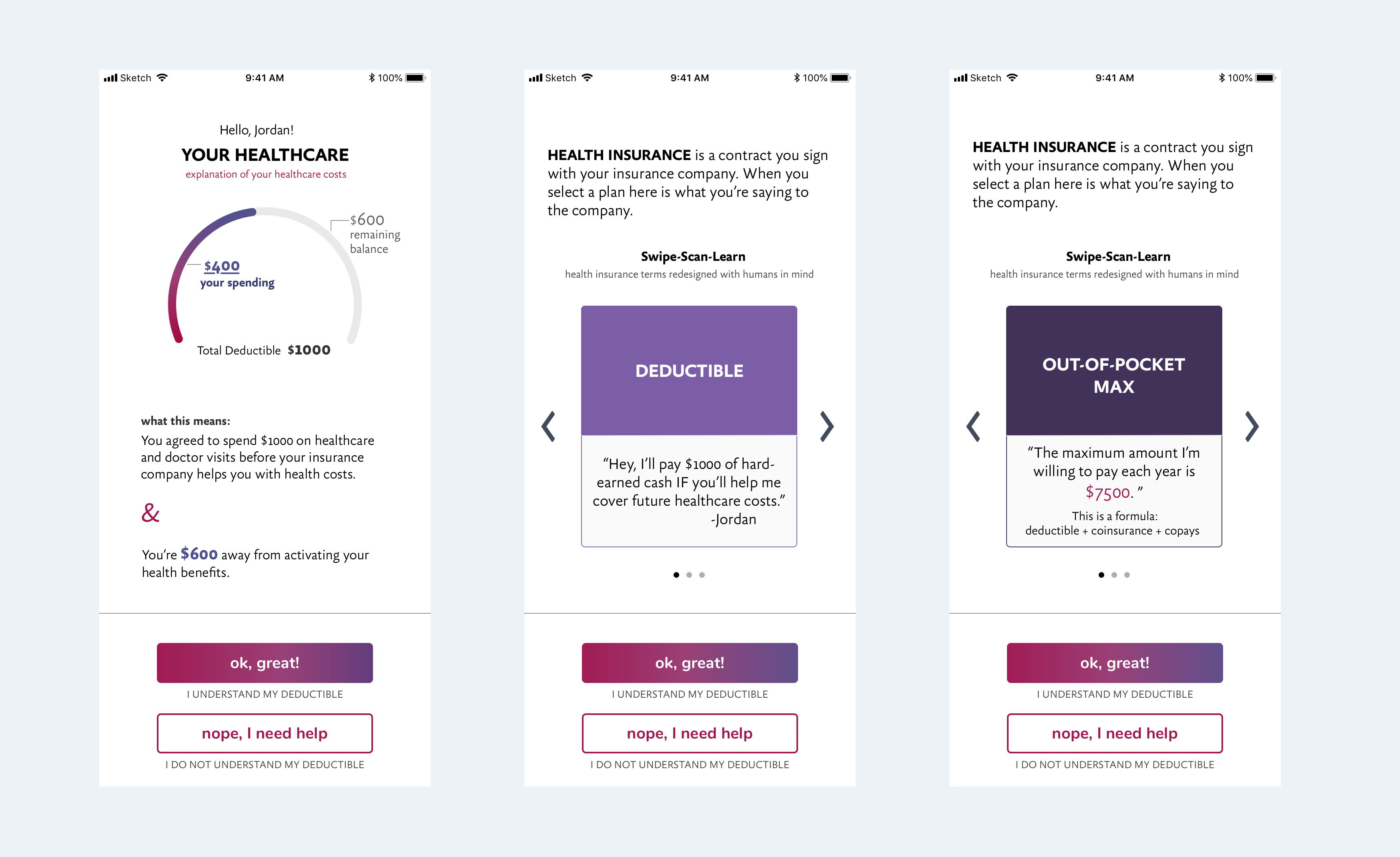 Right away the user can see how much they have spent towards their deductible and an explanation of what that means.