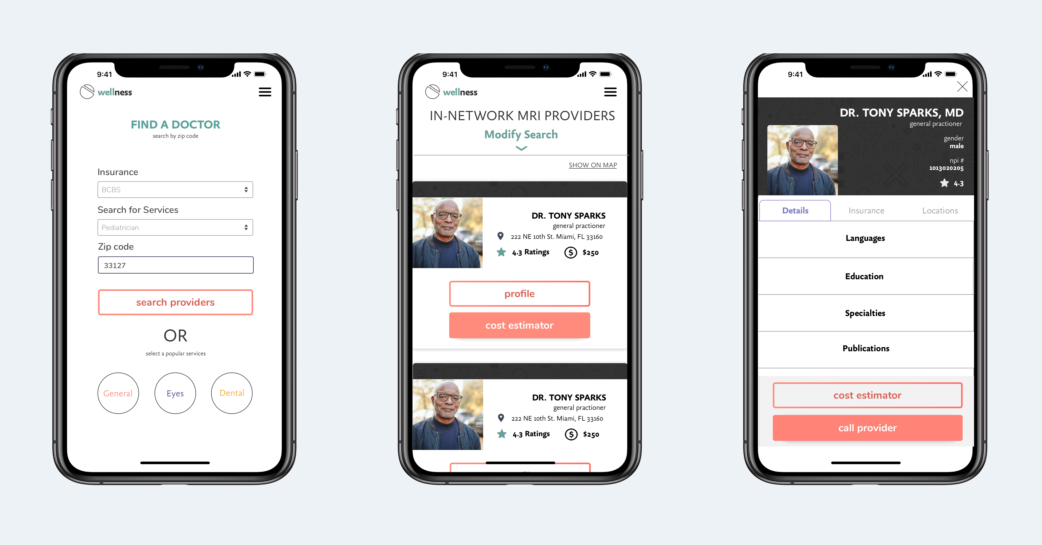 The search functionality was designed to be quick by adding a drop-down and search bar. Our users can also search by clicking a service-specific hot button. The results would sort by relevance to location and insurance coverage.
